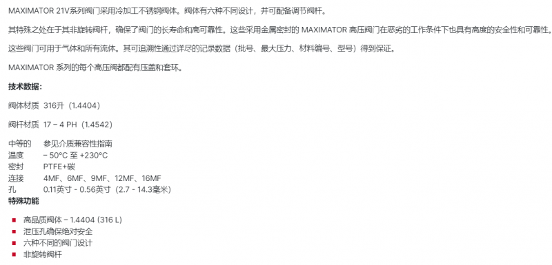 MAXIMATOR 閥門 22500 psi系列