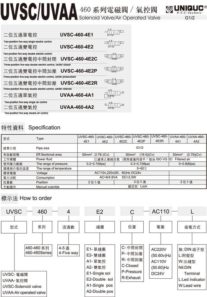 UNIQUC 二位五通單電控電磁閥UVSC-460-4E1