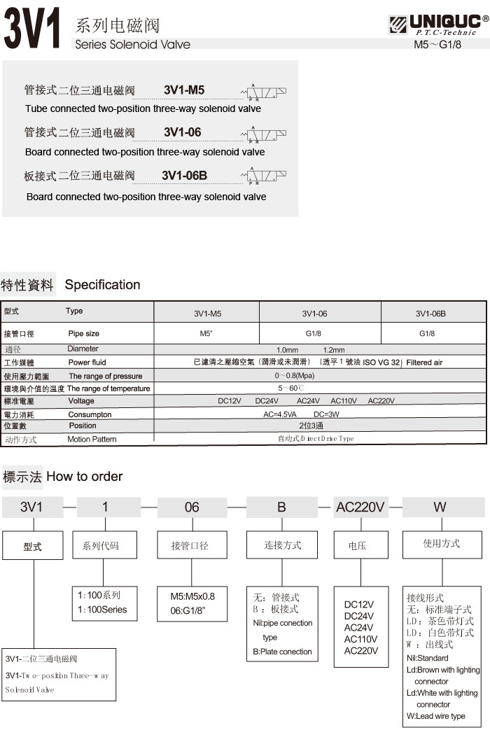 UNIQUC 板接式二位三通電磁閥3V1-06B系列