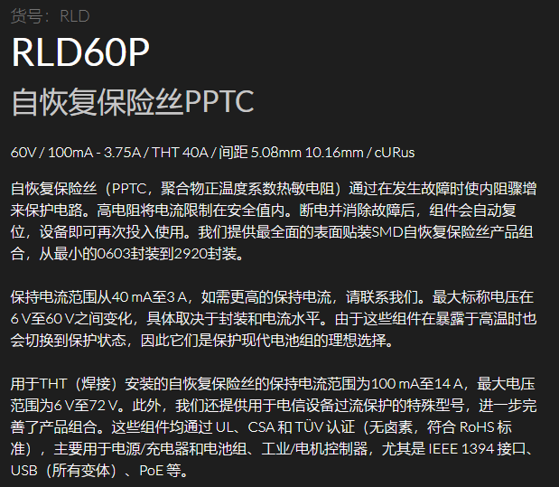 INTER CONTROL 自恢復保險絲RLD60P系列