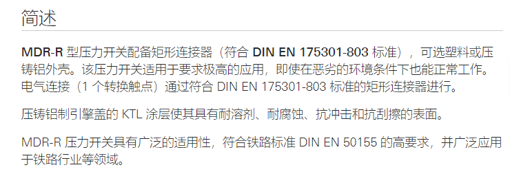 Condor 帶矩形連接器的 MDR R 型壓力開關系列
